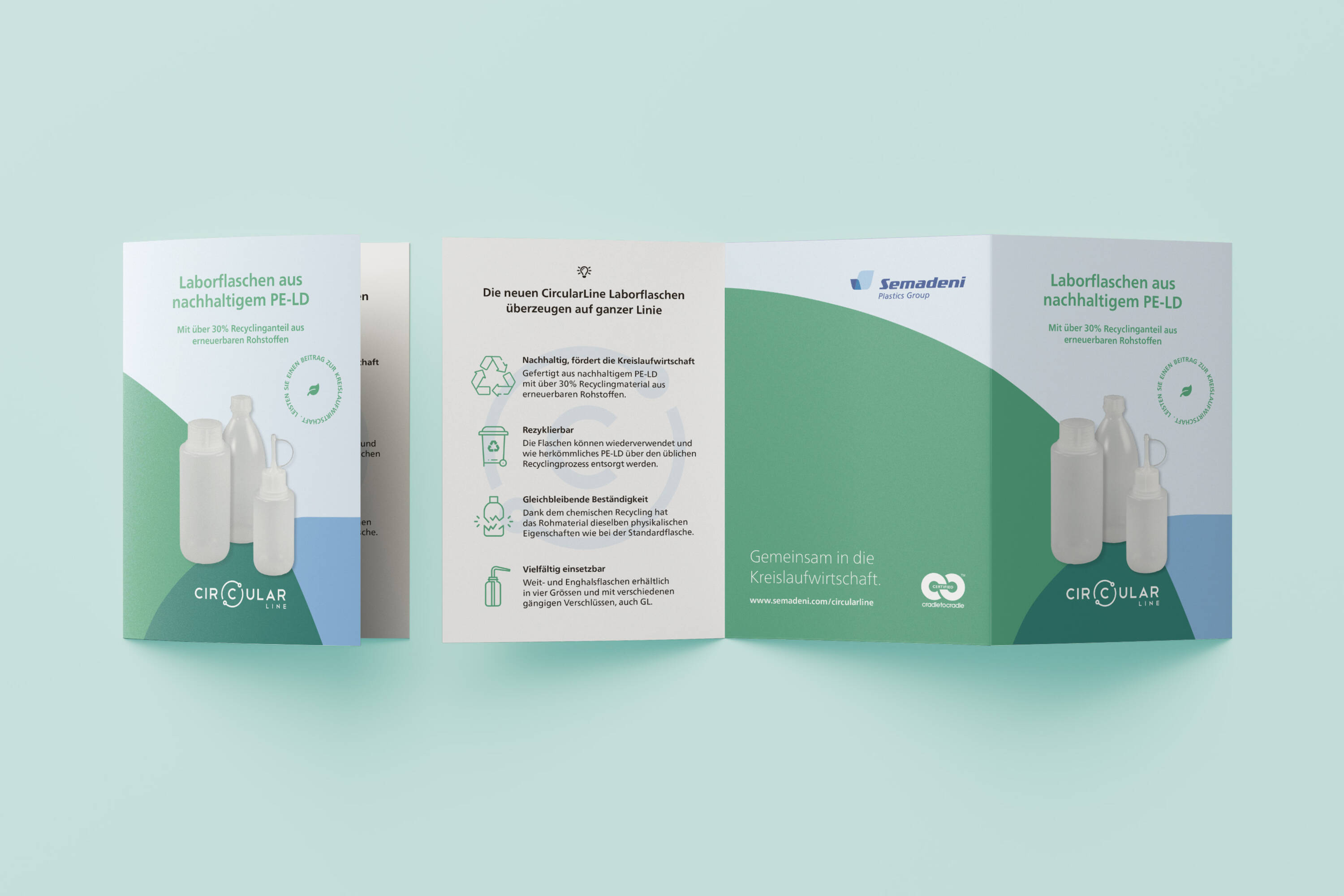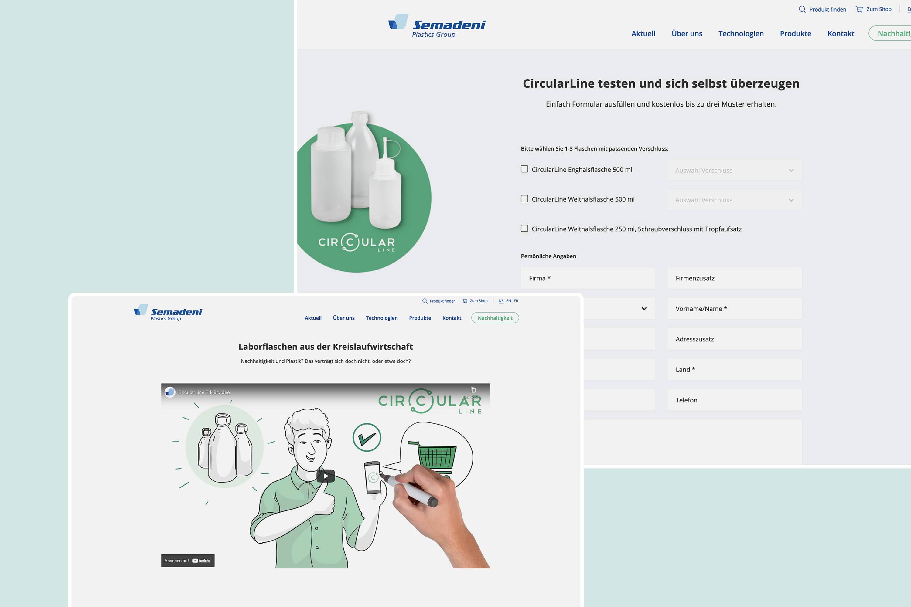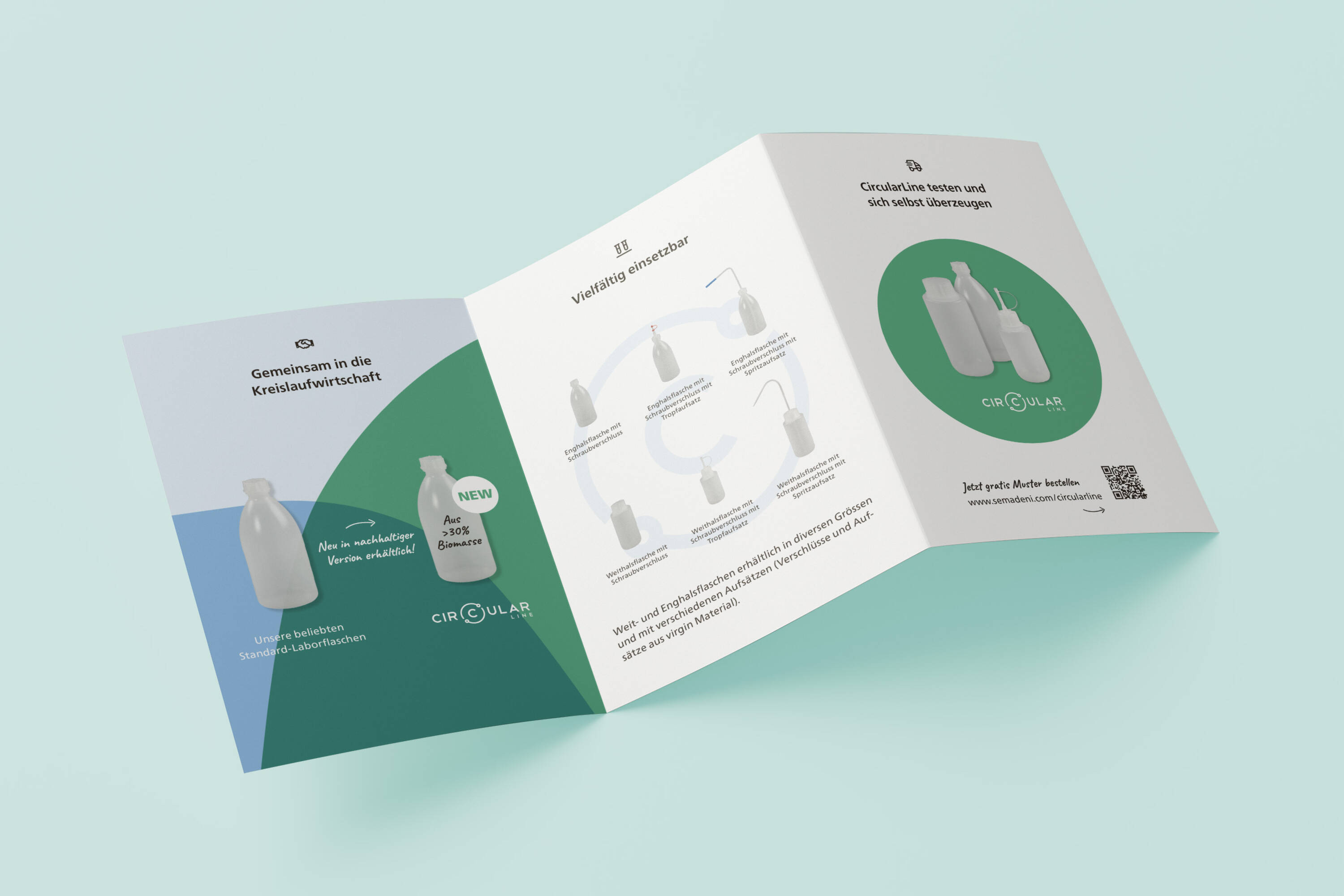 Unseren Kunden Semadeni AG unterstützen wir bei der Lancierung seiner neuen Produktlinie "CircularLine". Die neuen CircularLine Laborflaschen bestehen aus über 30% Biomasse: anstelle von fossilen Materialien werden bei der Herstellung grösstenteils erneuerbare Rohstoffe verwendet. Mit diversen On- und Offline-Kommunikationsmassnahmen (Landingpage mit Musterbestellformular, Flyer, Selfmailer, Musterflaschen, Rollups usw.) möchte Semadeni seine Kunden zum Wechsel von den Standardlaborflaschen auf die neuen nachhaltigen Circularline Laborflaschen animieren und rund um das Thema Kreislaufwirtschaft aufmerksam machen.