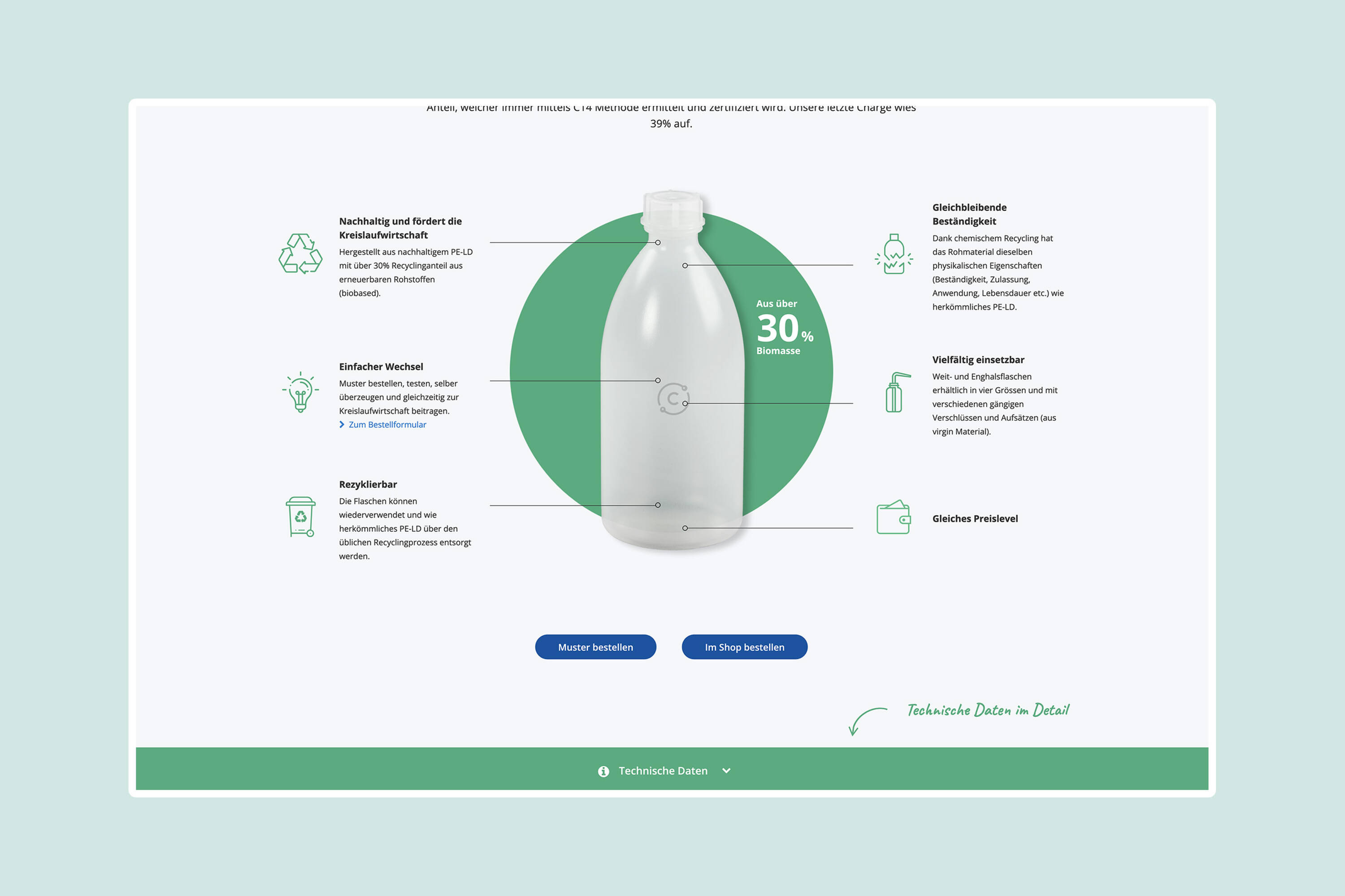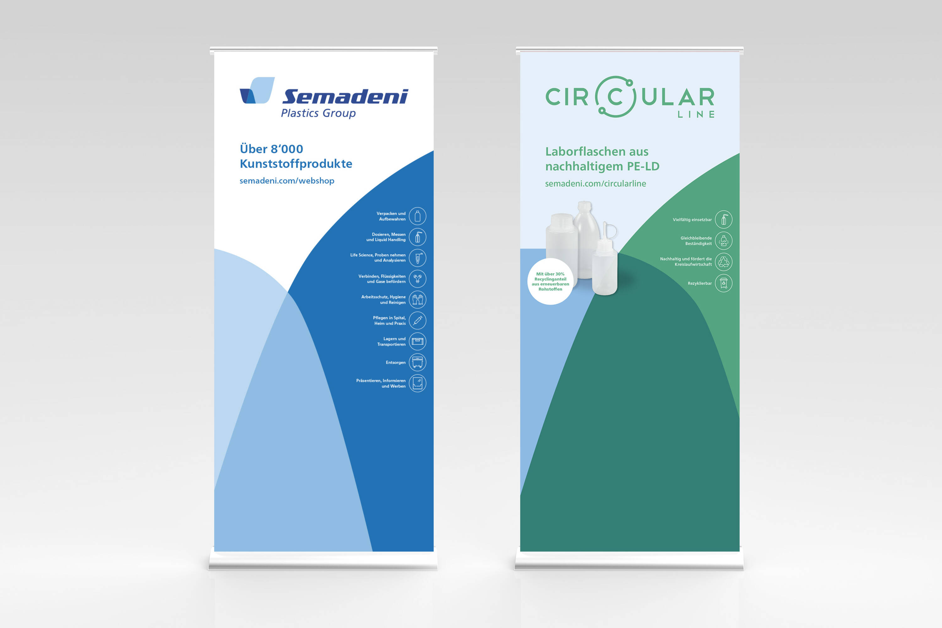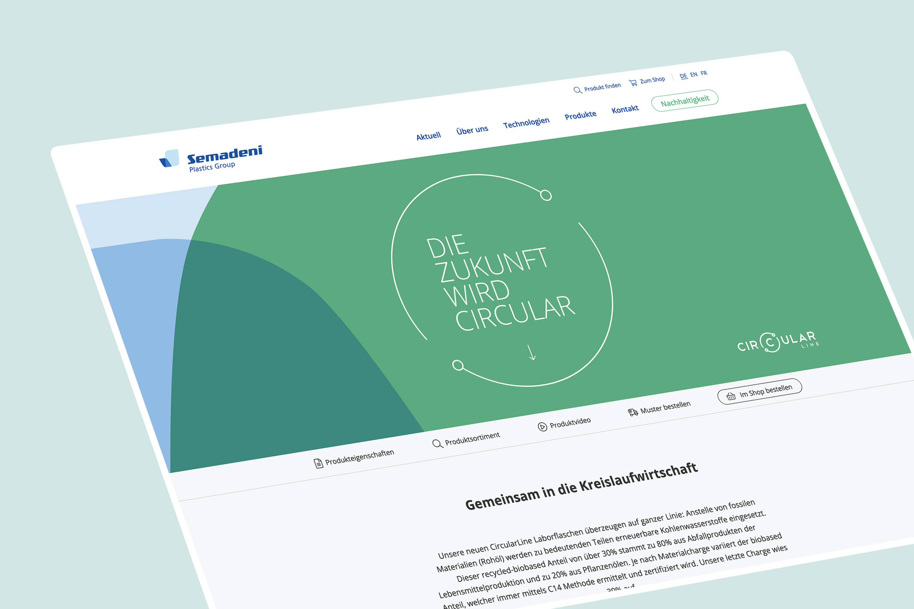 Unseren Kunden Semadeni AG unterstützen wir bei der Lancierung seiner neuen Produktlinie "CircularLine". Die neuen CircularLine Laborflaschen bestehen aus über 30% Biomasse: anstelle von fossilen Materialien werden bei der Herstellung grösstenteils erneuerbare Rohstoffe verwendet. Mit diversen On- und Offline-Kommunikationsmassnahmen (Landingpage mit Musterbestellformular, Flyer, Selfmailer, Musterflaschen, Rollups usw.) möchte Semadeni seine Kunden zum Wechsel von den Standardlaborflaschen auf die neuen nachhaltigen Circularline Laborflaschen animieren und rund um das Thema Kreislaufwirtschaft aufmerksam machen.