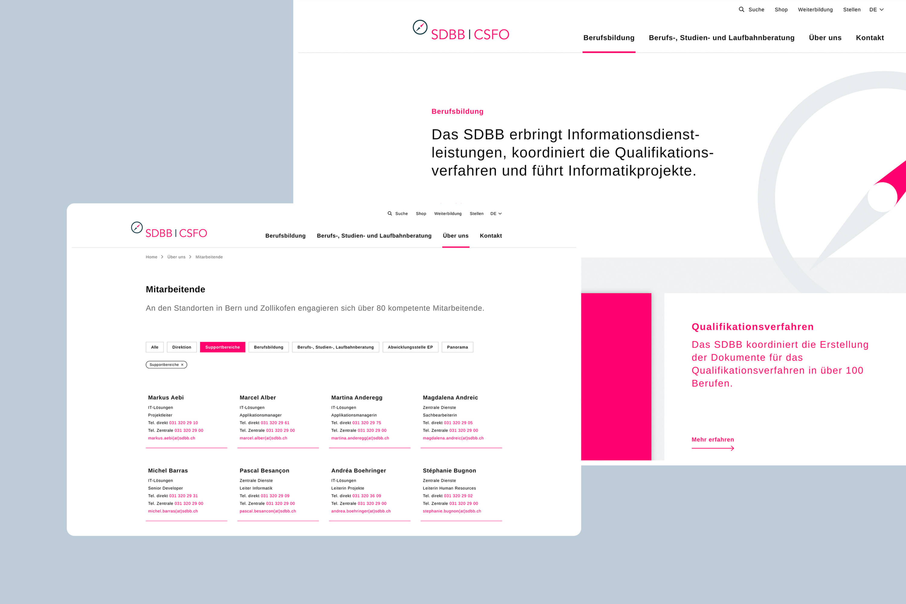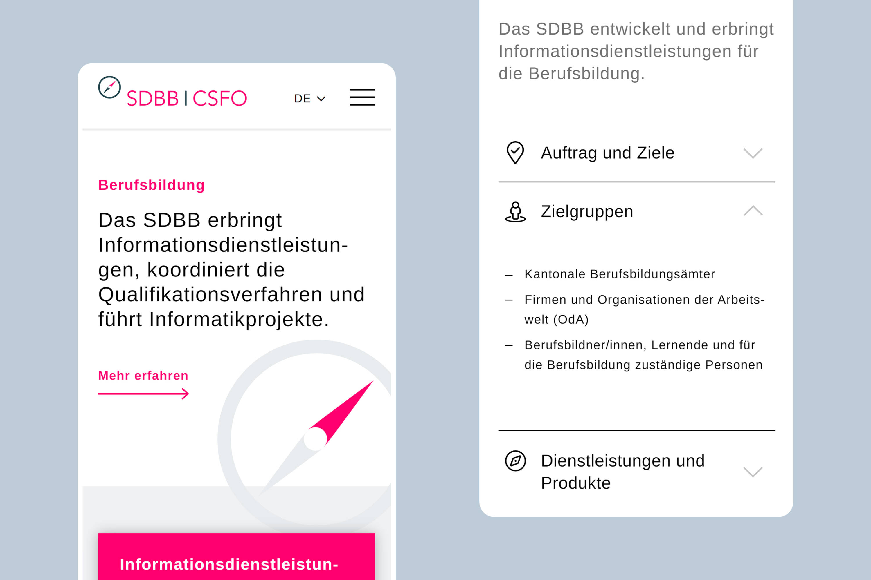 Das Schweizerische Dienstleistungszentrum Berufsbildung | Berufs-, Studien- und Laufbahnberatung (SDBB) ist eine Fachagentur der Schweizerischen Konferenz der kantonalen Erziehungsdirektoren EDK. Es bietet im Auftrag der Kantone Dienstleistungen und Produkte in den Bereichen Berufsbildung und Berufs-, Studien- und Laufbahnberatung an. Mit der neuen Website präsentiert sich das SDBB gegenüber Partnern, Behörden, Bewerberinnen/Bewerbern und Medien als attraktives, professionelles Dienstleistungszentrum. Ausführliche Projektinformationen, Fachinhalte und Supportseiten für spezifische Zielgruppen werden neu von der Unternehmenswebsite getrennt und in einem Servicebereich zugänglich gemacht.